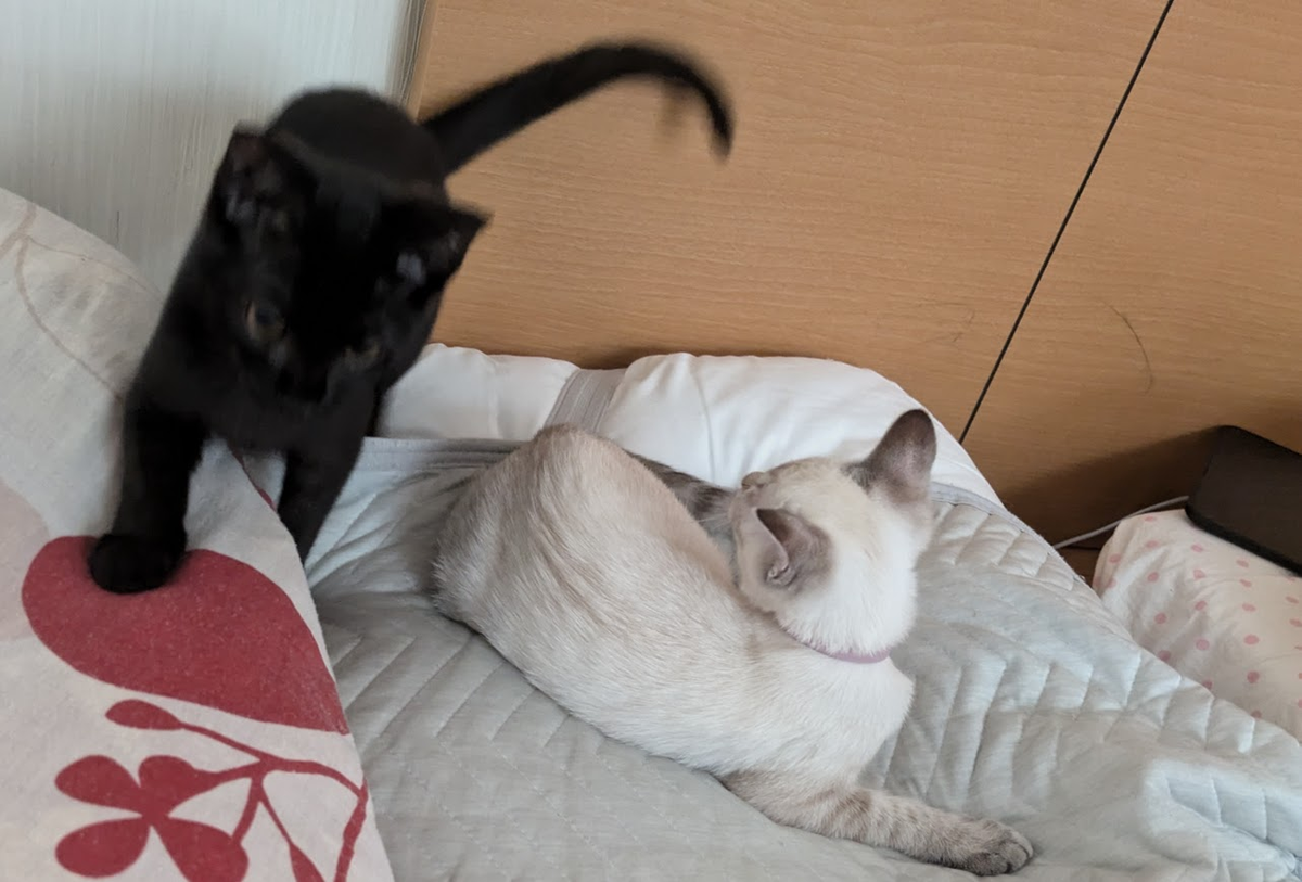 譲り受けたあとに、姉妹揃ってウイルス性の病気が発覚したり、1匹が着地失敗で脚を痛めたり、エアコン使いすぎて低体温にしてしまったり・・・